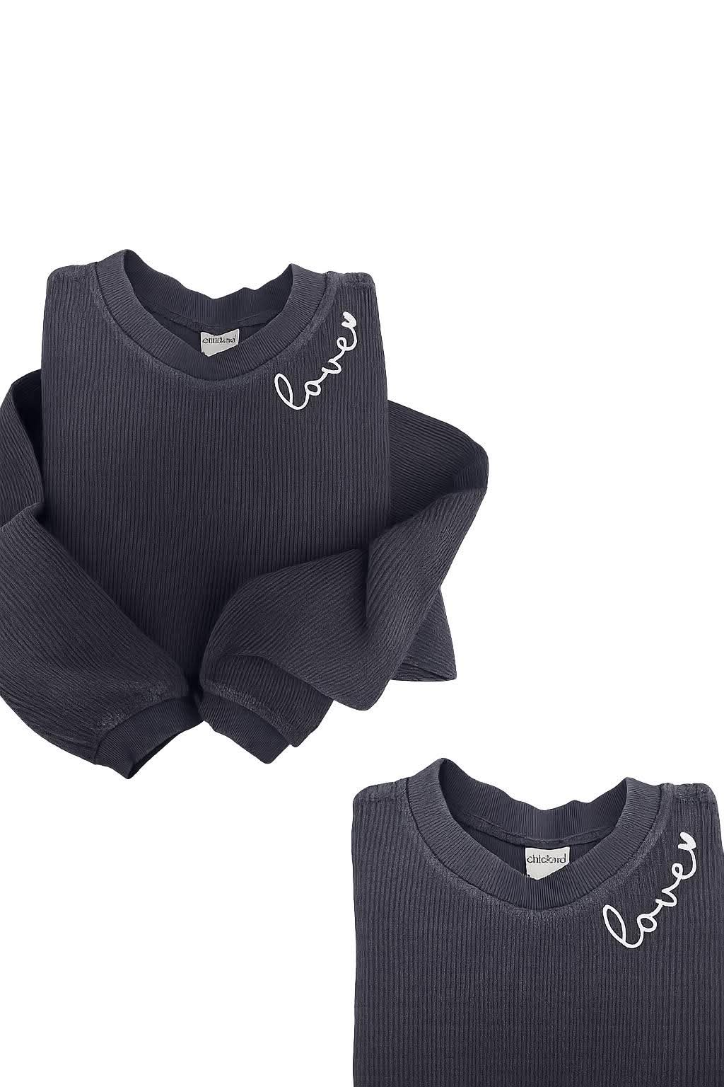 Comes in thread colors (as shown) on a black corded crewneck.